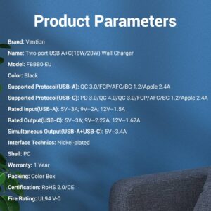 Phone Charger SKU: 6922794790193 VENTION FEFB0-EU 2-Port USB (C + C) GaN Charger (45W/45W) EU-Plug Black 60,00 ₾
